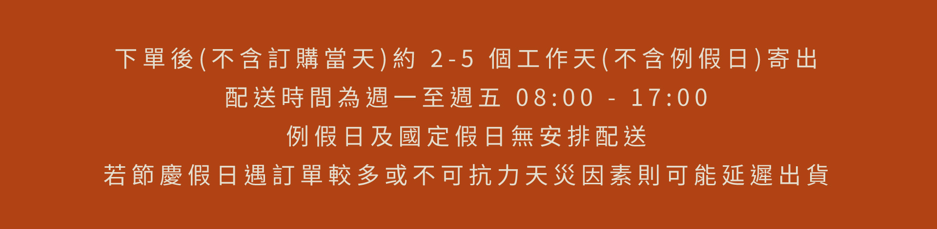 出貨天數:消費者下單後,約3-5 天個工作天會進行出貨(寄出商品)。